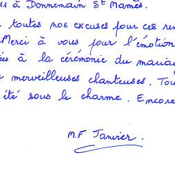 Mariage superbe. Vos prestations ont contribué à la réussite de ce bel événement. La magie nous a tous envoûté et emporté, les invités étaient ravis et émus. Je tiens à vous féliciter, Margaux et Jean-Baptiste n\'ont pas fait d\'erreur en vous faisant les élus pour nous accompagner lors de cette journée gravée dans nos cœurs. Votre générosité était à la hauteur de nos espérances, encore toutes nos félicitations et Bravo à tous.